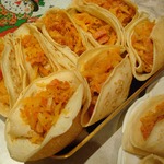 7. Сложить каждый блин треугольником и выложить овощную начинку.