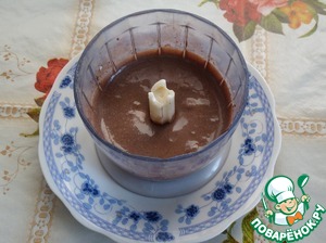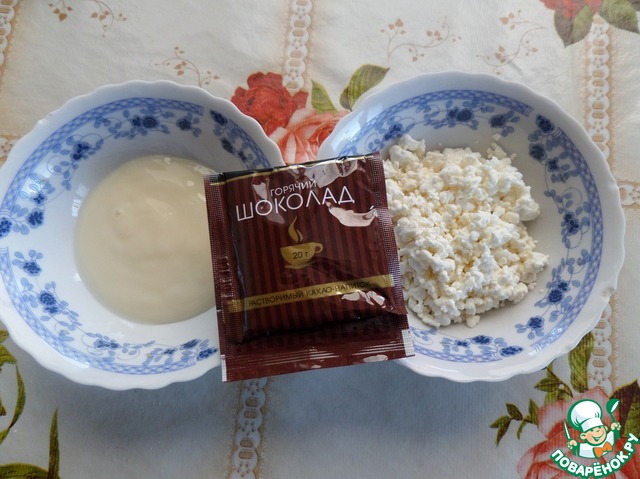 В чашу блендера закладываем творог, растворимый какао-напиток, сгущенное молоко.
