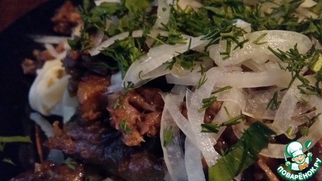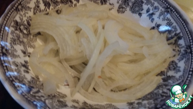 И завершает всю конструкцию слой маринованного лука и рубленной зелени.