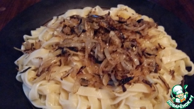Теперь можно собирать блюдо, причем делать это надо очень быстро, к. к. баранину лучше есть очень горячей. На дно большого блюда выложить слой макарон и посыпать их обжаренным репчатым луком.