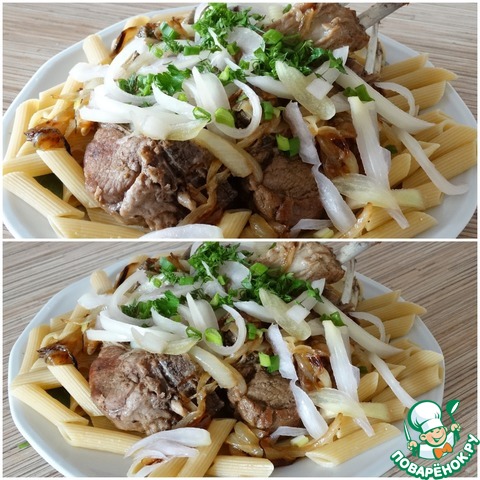 Лук тонко нашинковать и разделить на 3 части. Одну часть вместе с мясом обжарить в мультиварке, затем установить режим "Тушение" и томить мясо в собственном соку 2,5 час. Вторую часть замариновать, или просто ошпарить кипятком и сбрызнуть виноградным уксусом. Третью часть репчатого лука обжарить до золотистого цвета. Макароны /они должны быть из твердых сортов пшеницы, или домашние/ отварить до состояния аль денте.