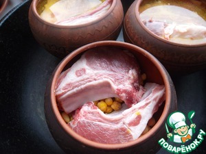 Загружаем горшочки: 1 - лук, резаный мелким кубиком; 2 - нут (предварительно необходимо замочить часа на 3...4); 3 - куркума; 4 - мясо; 5 - вода. Посолим, поперчим по вкусу...