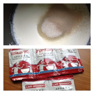 Молоко подогреть. Добавить сахар и дрожжи. Перемешать.