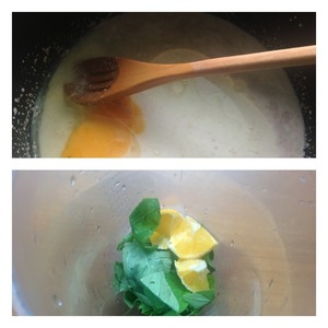 Влить масло и добавить яйцо. Взбить венчиком. В чашу блендера выложить очищенный киви, мяту и лимон, нарезанный на ломтики. Кожу с лимона снять. Все пюрировать.