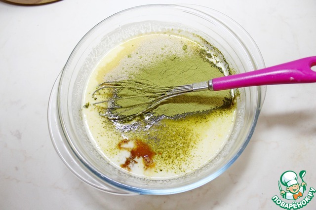 Добавить просеянный через ситечко зеленый чай Матча, ванильный экстракт.