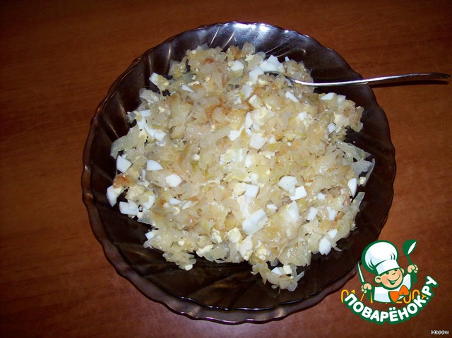 Пока тесто отдыхает, готовим капустную начинку - какая вам нравится. У меня - тушеная капуста с луком и рублеными отварными яйцами.