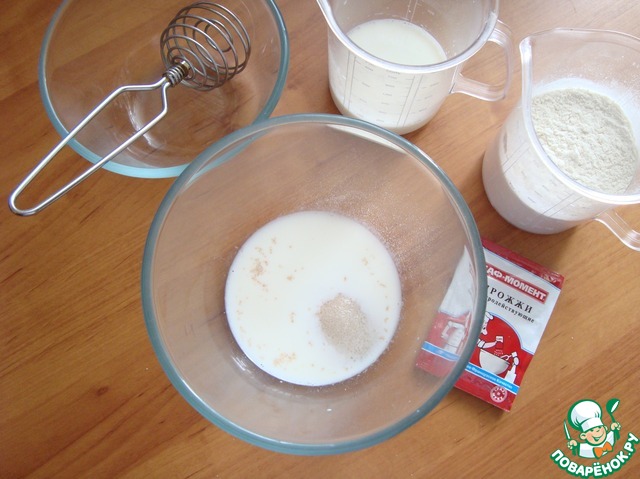 Греем немного молоко и выливаем его в посуду, растворяем в нём дрожжи, добавляем сахар. Перемешиваем.