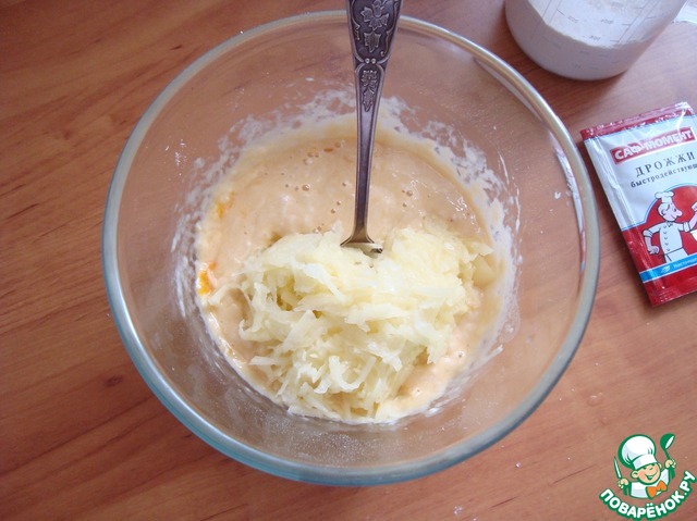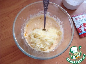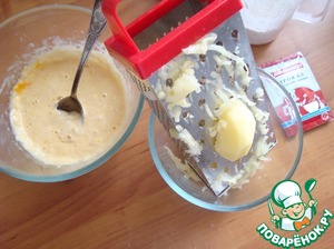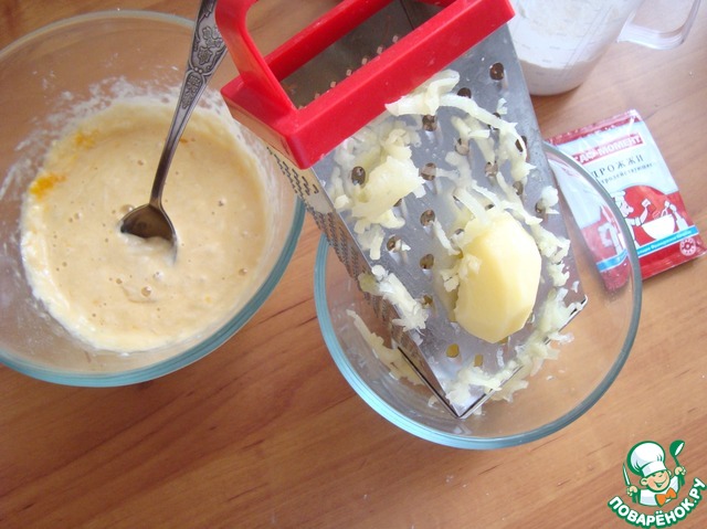 Натираем лук и картофель на тёрке. Чтобы картофель не потемнел, первым трём лук.