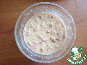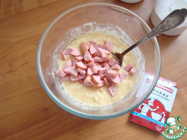 Добавляем оставшуюся муку 45 г, масло подсолнечного 1 ст л. Нарезаем сосиски и тоже отправляем в тесто.