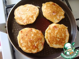 Выпекаем оладьи. Подмазываем сковороду, греем её и выкладываем тесто ложкой. Когда оладьи схватятся и красиво обжарятся, убавляем огонь на MIN.