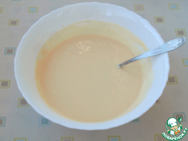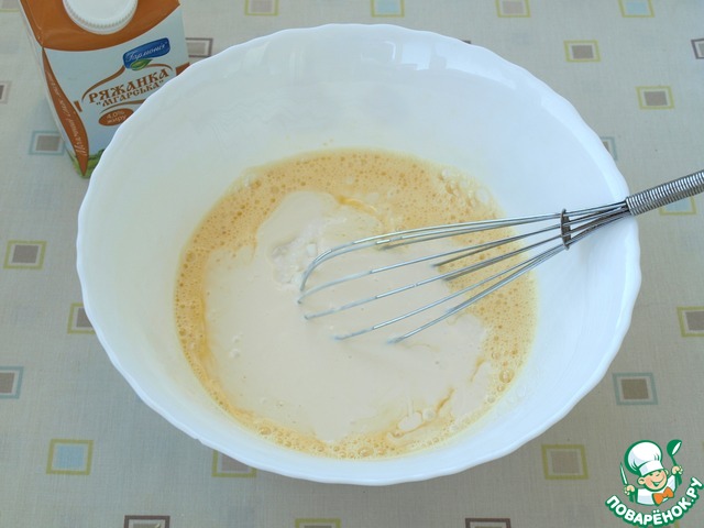 В ряженку насыпать соду, размешать и вылить всё в миску. Всю массу хорошо перемешать венчиком.