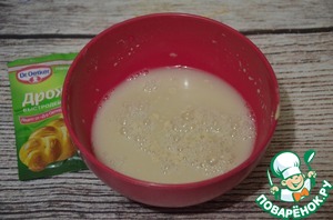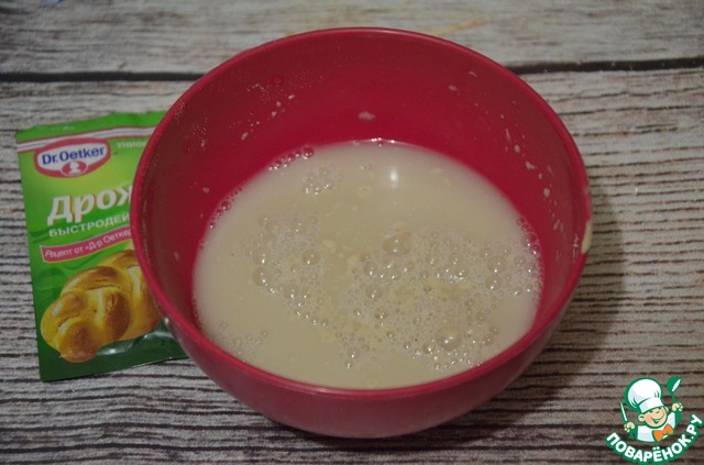 Оставшиеся 10 г сахара и дрожжи сухие (у меня как на фото) добавляем к теплой воде и перемешиваем. Оставляем на 5-10 минут.