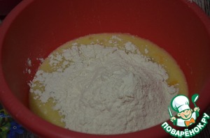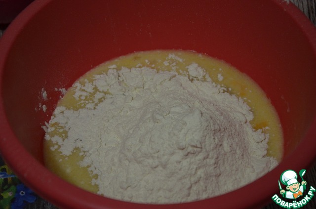 Частями просеиваем муку. Выкладываем массу на подпыленную мукой поверхность и начинаем вымешивать тесто.