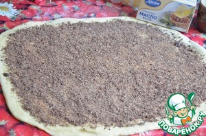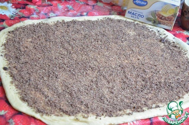 Для начинки шоколад натираем на терке, смешиваем с сахаром. Растопленным маслом смазываем тесто и равномерно посыпаем шоколадную смесь. Аккуратно скатываем тесто в рулет.