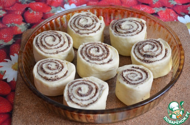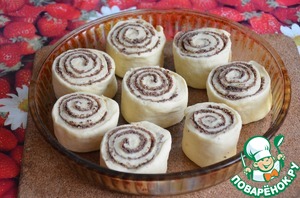 Нарезаем готовый рулет. Ширина отрезаемых сегментов должна быть примерно ровна высоте вашей формы, в которой будете их выпекать. Выкладываем в смазанную маслом форму так, чтобы между ними было небольшое пространство. У меня получилась одна такая формочка и еще отдельно 5 штучек. Накрываем полотенцем и оставляем на 15-20 минут.