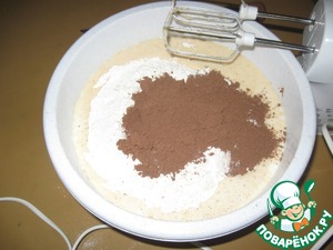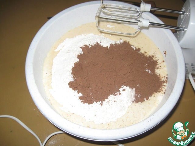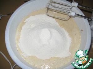 • Муку просеиваем, смешиваем с разрыхлителем, добавляем в тесто