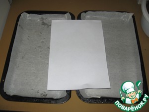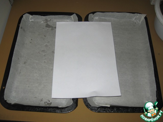 • Выстилаем форму пергаментом. Я использую противень 25х35 см и обычную кальку. У меня их два, получается два коржа. Лист А4 положил для масштаба