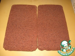 • У меня коржи получаются толщиной 3-4 см, поэтому каждый разрезаю еще пополам, подравниваю края, срезаю неровности