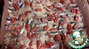 Посыпаем: помидорками, чесноком, орегано, панировочными сухарями и поливаем оставшимся оливковым маслом.