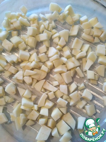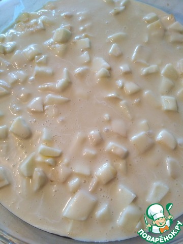 Яблоки распределить по форме, смазанной растительным маслом ( у меня стеклянный противень довольно большой, поэтому яблоки лежат не вплотную, в форме меньшего размера пирог получается выше).