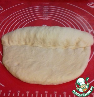 Затем тесто раскатываем в прямоугольник, и начинаем его заворачивать в рулончик так, как показано на фото.