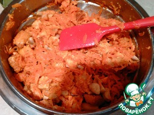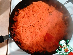 Морковь помыть, очистить и натереть на крупной тёрке. Обжарить на растительном масле до готовности, но не зажаривать!!! Она должна быть мягкой, готовой, но не золотой. Слегка посолить и поперчить. Переложить в миску.