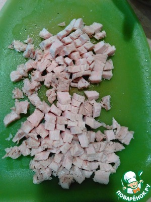 Куриную или индюшиную половину грудки нарезать кубиками, чуть крупнее чем на оливье. Добавить к салату.