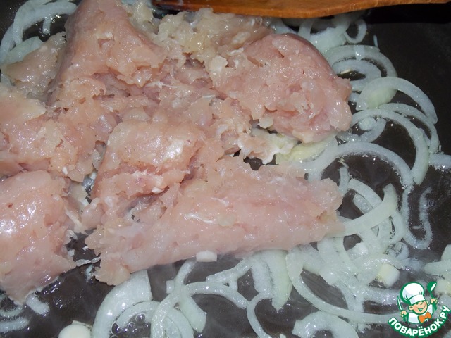 Лук нарезать полукольцами, обжарить на растительном масле в течении 2х минут.