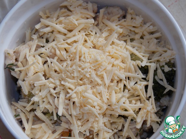 Переложить в форму для запекания, сверху посыпать тёртым сыром.