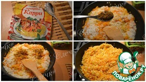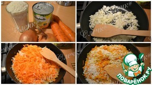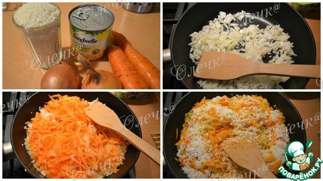 Готовим подушку: на сковороде с 2-мя ложками подсолнечного масла обжариваем лук, затем добавляем туда тертую на крупной терке морковь, добавляем промытый рис.