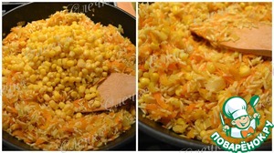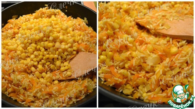Выкладываем баночку кукурузы. Не нужно стремиться довести смесь до готовности, наша задача в том, чтобы все ингредиенты хорошо перемешались и пропитали друг друга ароматами. На всё про всё уходит максимум 5 минут.