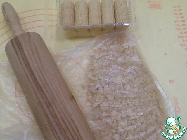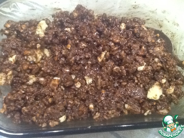 Берем первый корж. Выкладываем на него орехово-вафельно-шок оладную смесь. Убираем в холод.