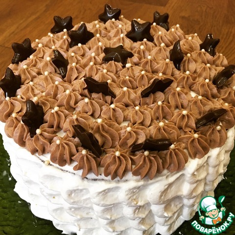 С помощью формочки и растопленного шоколада сделала звездочки. И украсила ими тортик. -