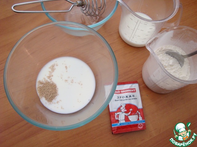 100 мл тёплого молока выливаем в посуду и растворяем в нём дрожжи. Добавляем сахар 1 ч л. венчиком соединяем.