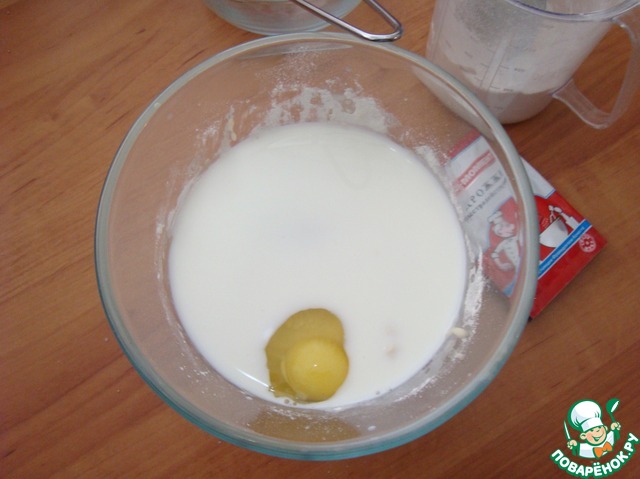 Выливаем в опару оставшееся молоко, кладём соль 1/4 ч л и разбиваем яйцо. Опять всё венчиком соединяем.