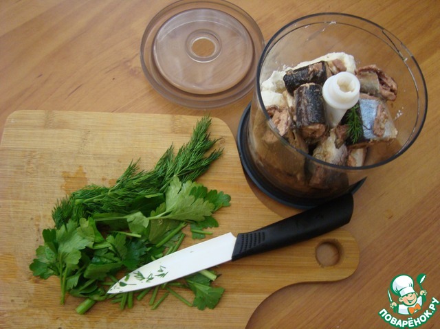 Пока тесто доходит, делаем начинку. В блендер выложила творог и рыбу из банки без жидкости, порезала зелень, отправила к рыбе и творогу, положила соль.