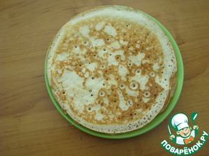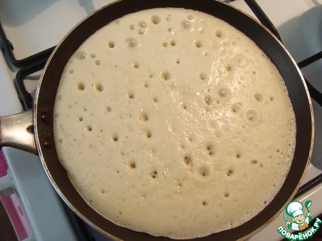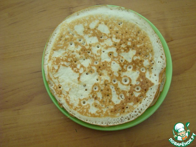 Выпекаем толстые и большие блины. Сковорода у меня D-24 см. На разогретую, подмазанную сковороду наливаем тесто. На 1 блин-1 поварёшка теста. Жарим с одной стороны. Вот такие дырчатые блины у меня!