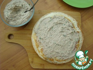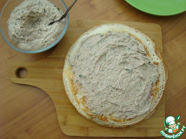Выкладываем начинку и промазываем блин ей, не домазывая края.