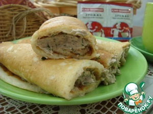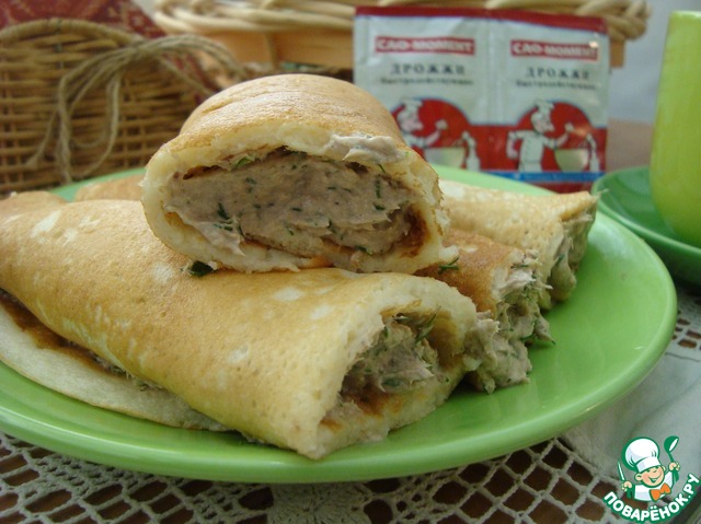 Рулеты из толстых, больших, дрожжевых блинов с сайрой натуральной-консервы, творогом обезжиренным и зеленью: укропом и петрушкой. Это вкусно!