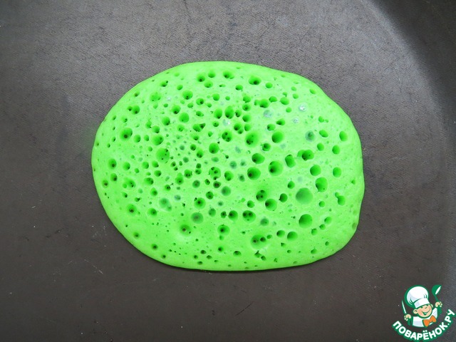 Выпекать блины на антипригарной сковородке только с одной! стороны. Выливаем небольшой половник с тестом на середину сковороды, тесто само чуть-чуть растекается и получается блин. Признак готовности блина – полностью подсохший (без влажных пятен) верхний слой.