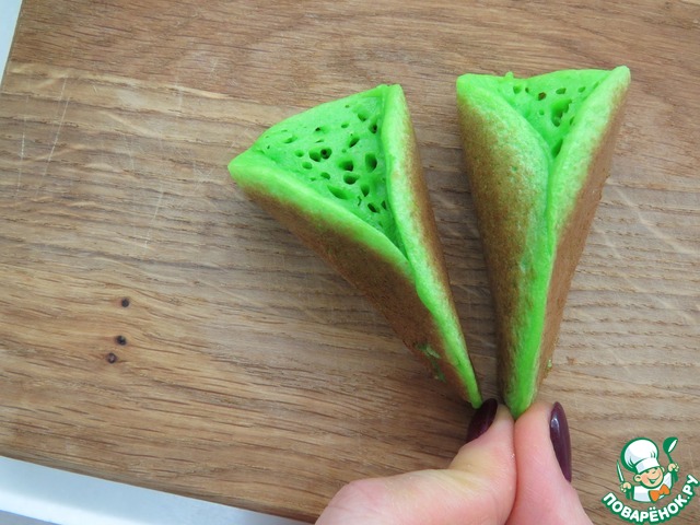 Горячий блинчик кладем на разделочную доску и защипываем с одного края на несколько секунд. Таким образом защипываем все блинчики.