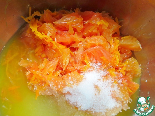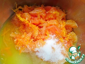 Апельсин (у меня красный) и лимон очистить от междольковых перегородок. Сок цитрусовых и мякоть складываем в кастрюльку, добавляем сахар и цедру, ставим на средний огонь до растворения сахара, периодически помешиваем.