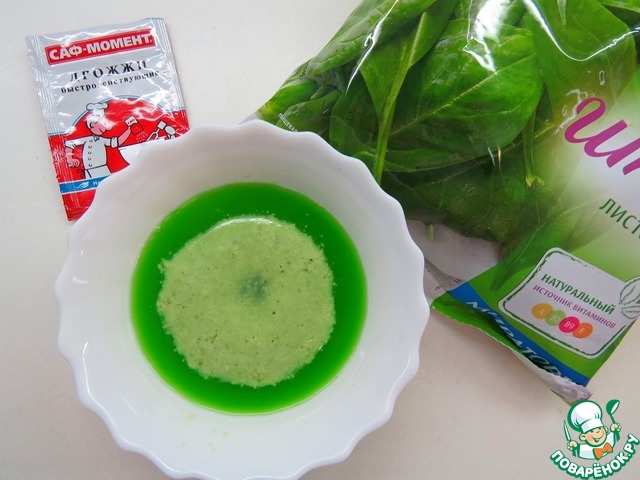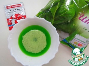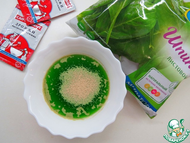 Готовим шпинатные блинчики. Шпинат выложить в чашу блендера, залить 125 мл теплой воды, пробить блендером до однородности. В теплый шпинатный сок (125 мл) кладем пол чайной ложки сухих дрожжей и сахар. Оставляем на 5-10 минут.