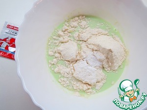 В эту смесь добавляем молоко, муку, размешанную с разрыхлителем, и хорошо перемешиваем. Оставляем на 20 минут.