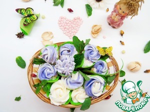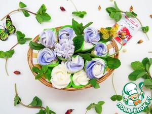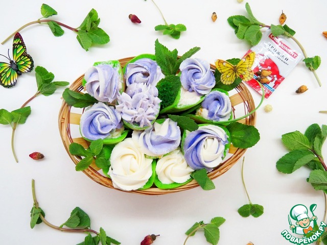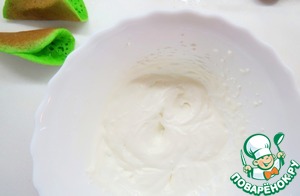 К взбитым сливкам подмешиваем пастообразный или протертый через сито творог, вымешиваем до однородности. 1/3 крема откладываем, он нам нужен для того чтобы сделать кремовые цветочки.