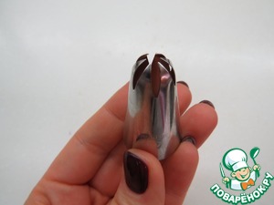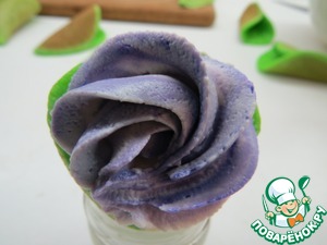 В отложенную 1/3 часть творожно-сливочного крема добавляем краситель (по желанию), помещаем в кулинарный мешок и отсаживаем крем в виде цветов. Для этого хорошо использовать насадки типа "звезда" (открытая звезда 1М, закрытая звезда 2D). Я брала насадку Wilton 2D