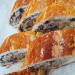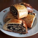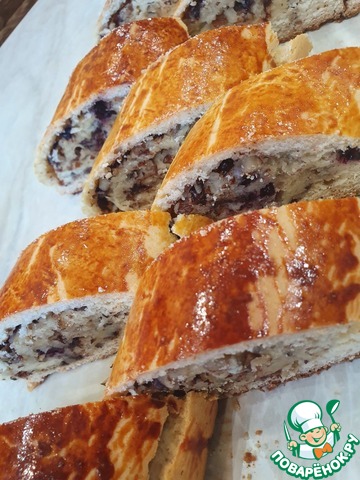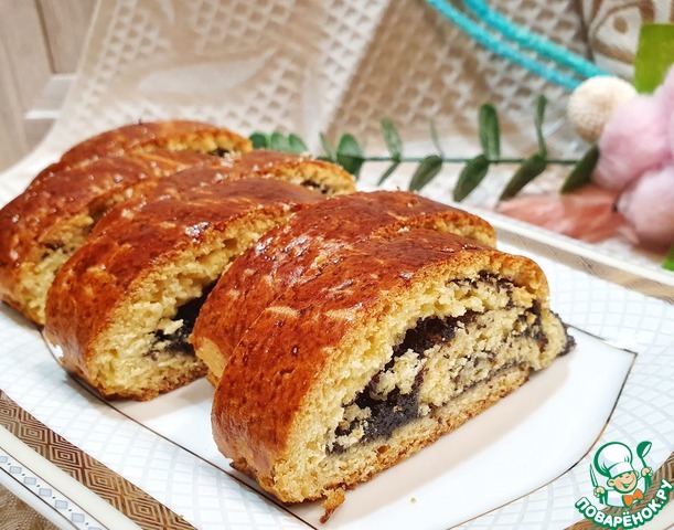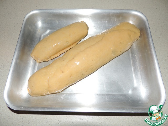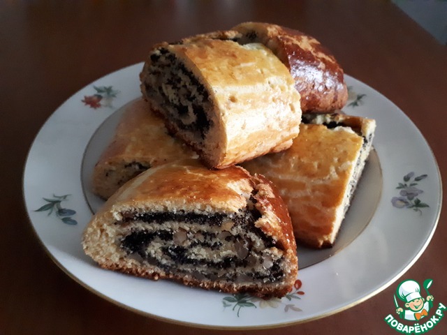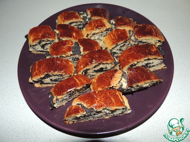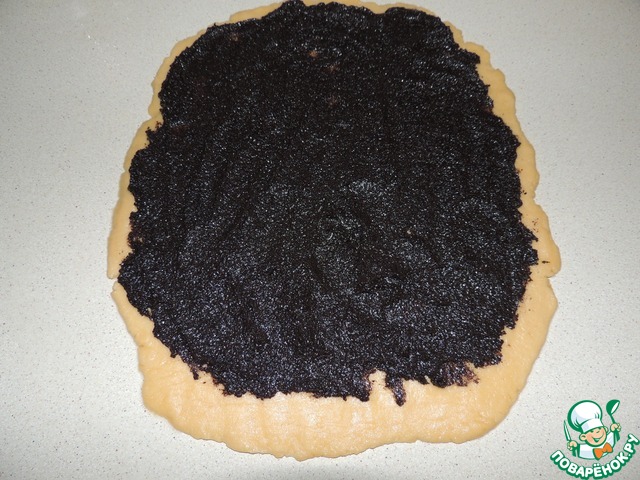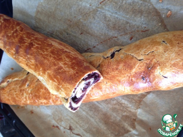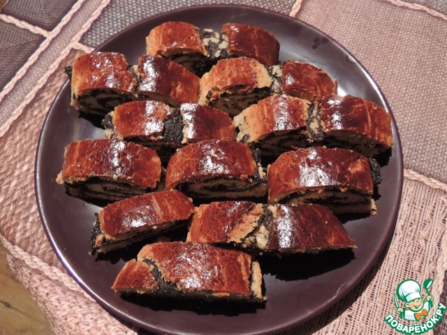 Смазываем оставленным ранее взбитым яйцом и убираем в духовку при 180 на 30 минут. Из данного количества теста должно получится 2 рулета, но у меня как обычно не хватило начинки. Слишком расточительно я её использовала. Оставила кусочек теста на печеньки