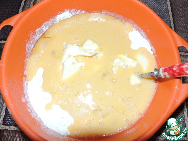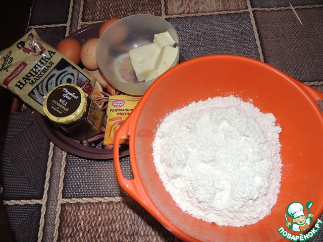 Начнём с теста. Просеиваем 500 гр муки и перемешиваем с пакетиком разрыхлителя (10гр), добавляем 200 гр мёда, 150 гр размягчённого сливочного масла и 3 куриных яйца. Яйца взбиваем в отдельной миске и в тесто вливаем не всё, оставим буквально немножко для смазывания рулета