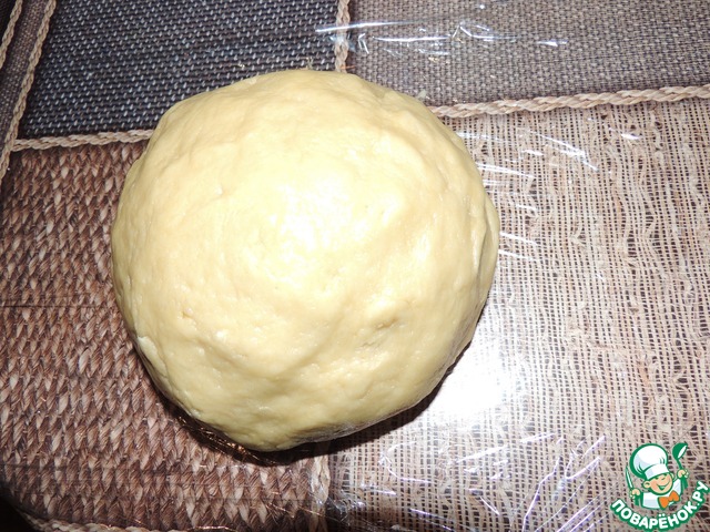 Всё тщательно перемешиваем сначала вилкой, а потом и руками. Сначала будет казаться, что тесто слишком липкое, но через пару минут замеса можно без труда скатать из него гладкий комок. Заворачиваем в пищевую плёнку и отправляем в холодильник. Честно говоря, я, отправляю на пол часа в морозилку, мне так удобнее потом с ним работать