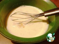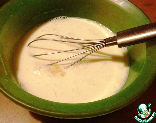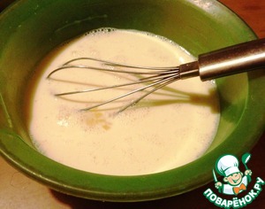 Яйца взбить с оставшимся сахаром и 300 мл молока. |